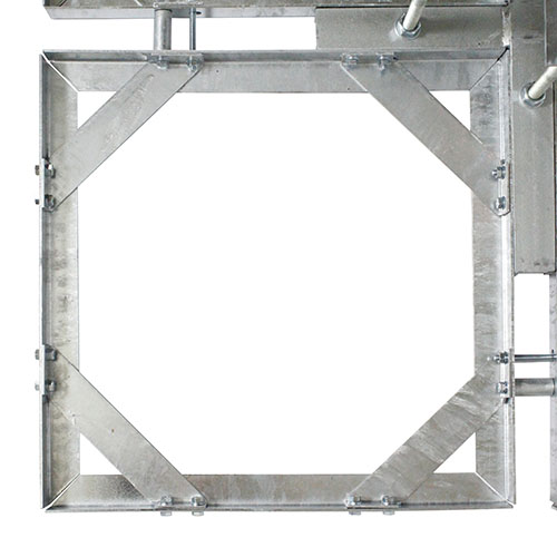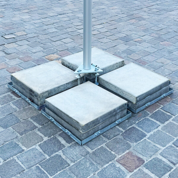 Mobile base for flagpole – designed for mobility, optimal stability, and effortless leveling, this robust steel base features a galvanized finish that resists corrosion. It securely holds stationary flagpoles ranging from 6 to 8 meters in height, offering unmatched durability and adaptability for commercial and institutional applications. Simply add 50cm x 50cm concrete slabs for extra weight and stability.
