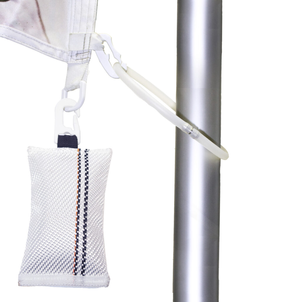 - Soft surface minimizes noise when hitting the flagpole. Attaches to the flag via a carabiner sewn into the flag’s lower edge and another sewn into the sandbag. It is recommended to thread a small hose through it to prevent it from moving away from the pole.